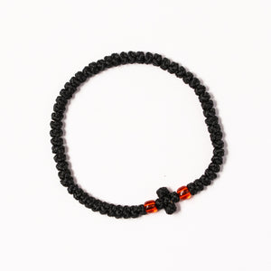Această brățară neagră împletită manual este un simbol clasic al credinței și protecției, având în centru un nod în formă de cruce, realizat cu migală, și două mărgele roșii ce dau un accent discret și elegant. Roșul este asociat tradițional cu protecția, iar negrul cu stabilitatea și puterea interioară.