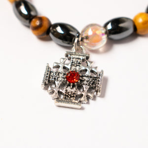 Această brățară deosebită combină armonios mărgele din lemn de măslin, elemente hematitice lucioase și mărgele irizate, creând un accesoriu elegant și plin de semnificație spirituală. În centru se află Crucea Ierusalimului, un simbol sacru al credinței și biruinței, împodobită cu o piatră roșie ce reprezintă focul divin, dragostea și protecția.