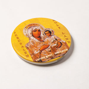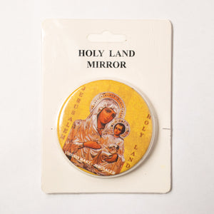 Această oglindă elegantă de poșetă este decorată cu icoana Maicii Domnului cu Pruncul, realizată în stil bizantin și adusă din Țara Sfântă. Imaginea sfântă este imprimată pe un suport rotund, cu nuanțe aurii care îi oferă un aspect luminos și sacru.