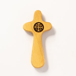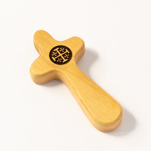 În centrul crucii este gravată Crucea Ierusalimului, formată dintr-o cruce principală înconjurată de patru cruci mai mici, simbol asociat cu răspândirea credinței creștine din Ierusalim către cele patru colțuri ale lumii. Gravura discretă completează simplitatea lemnului natural și păstrează un aspect sobru și autentic.