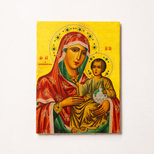 Această icoană deosebită o înfățișează pe Maica Domnului ținându-L pe Pruncul Iisus, în stilul artei bizantine autentice. Realizată prin tehnica litografiei pe lemn și îmbogățită cu fond auriu, icoana păstrează frumusețea tradițională a iconografiei răsăritene și aduce în casă lumină, pace și protecție.