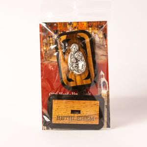 Această frumoasă statuetă realizată manual în Betleem îmbină lemnul autentic de măslin cu o reprezentare metalică delicată a Sfintei Familii – Iosif, Maria și Pruncul Iisus. Lemnul de măslin, cu textura sa unică și caldă, este considerat de creștini un simbol al păcii și binecuvântării, fiind deopotrivă prețuit pentru originea sa sfântă.