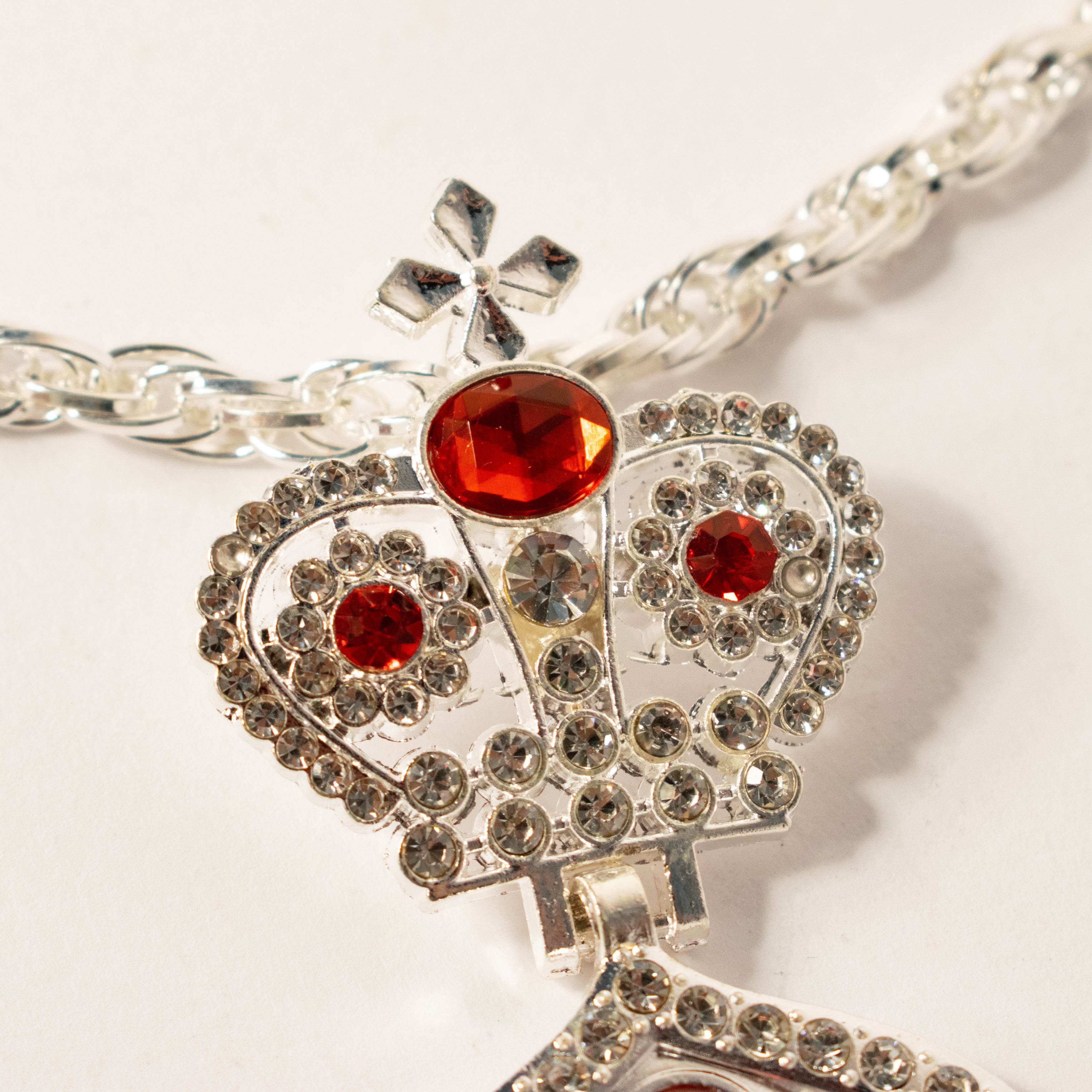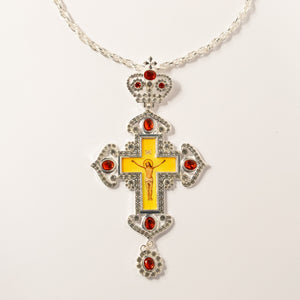 Partea superioară este încoronată de un motiv regal, sugerând domnia lui Hristos ca Împărat al cerului și al pământului, iar lanțul robust, lucrat cu grijă, conferă piesei stabilitate, prestanță și echilibru vizual.