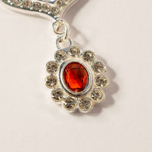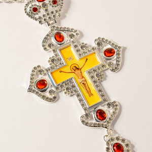 În centrul crucii se află icoana Mântuitorului Iisus Hristos răstignit, reprezentată pe fond luminos, evocând jertfa supremă, iubirea desăvârșită și biruința asupra morții. Conturul crucii este îmbogățit cu pietre decorative roșii și cristale strălucitoare, simbol al sângelui jertfei, al vieții și al împărăției cerești.