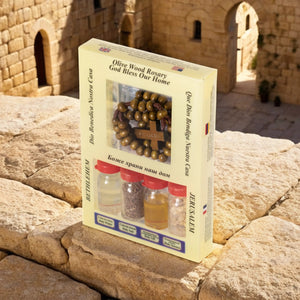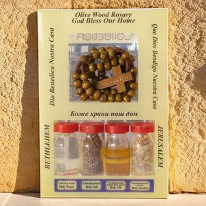 Acest set de binecuvântare adus din Țara Sfântă reunește patru elemente sacre, împreună cu un rozariu autentic din lemn de măslin, simbol al rugăciunii și al ocrotirii divine: