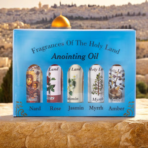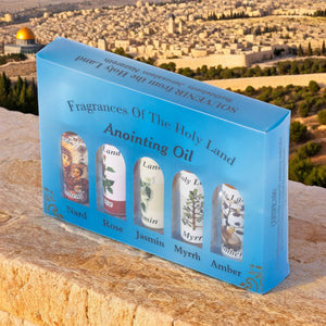 Acest set conține 5 Miruri de ungere autentice din Țara Sfântă, fiecare având o mireasmă cu profunde semnificații spirituale: