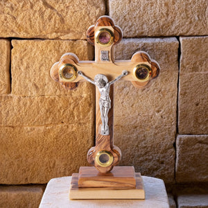 Cruce ortodoxă 16 cm lucrată manual din lemn de măslin, prevăzută cu suport stabil din același lemn pentru a fi așezată pe masă, altar sau poliță. În cele patru capsule sunt integrate elemente sfinte din Ierusalim (pământ, tămâie, flori și pietre), iar chipul Mântuitorului răstignit amintește de jertfă și Înviere. Un semn de protecție și binecuvântare pentru casa ta, ideal pentru colțul de rugăciune sau dar cu încărcătură spirituală.