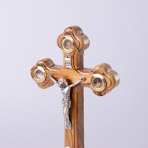 Această cruce ortodoxă din lemn de măslin, sculptată manual în Țara Sfântă, este mai mult decât un obiect decorativ — este o punte între cer și pământ. Fiecare dintre cele patru elemente cuprinde un element sacru: pământul sfânt din Ierusalim, tămâia din același loc binecuvântat, flori și pietre  — fiecare având o semnificaţie spirituală profundă: stabilitate, rugăciune, frumusețe și mărturie.