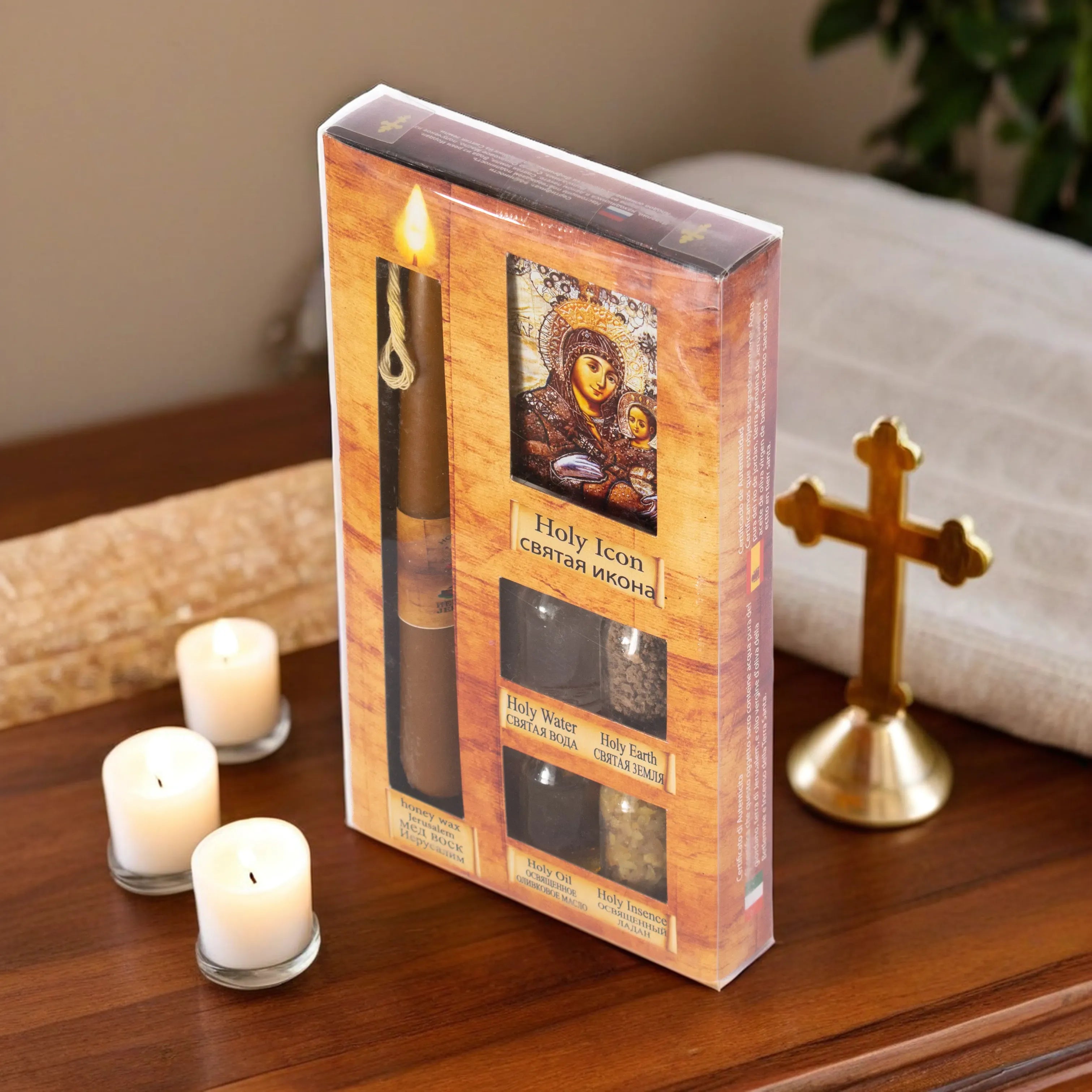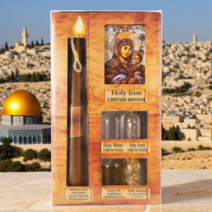 Set 4 Elemente Sfinte din Ierusalim + Icoană și Lumânare din Ceară Naturală de Albine