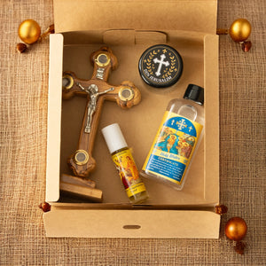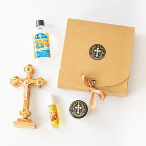 Acest set adus direct din Țara Sfântă este un dar unic de credință și protecție, îmbinând simboluri sacre care întăresc legătura cu harul divin. Fiecare obiect este sfințit și poartă amprenta locurilor sfinte, fiind ideal atât pentru rugăciune personală, cât și ca dar de suflet.